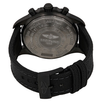 Black stainless steel case with a black fabric strap. Bi-directional rotating slide rule black stainless steel bezel. Black dial with silver-tone hands and Arabic numeral and index hour markers. Tachymeter scale around the outer rim. Dial Type: Analog-digital. Luminescent hands and markers. Perpetual calendar. Breitling Calibre 78 quartz movement. Scratch resistant sapphire crystal. Solid case back. Round case shape. Case size: 48 mm. Tang clasp. Water resistant at 50 meters / 165 feet. Functions: perpetual calendar, alarm, date, day, GMT, second time zone, hour, minute, second, power reserve indicator, chronometer. Sport watch style. Watch label: Swiss Made. Breitling Professional Chronospace Perpetual Alarm Chronograph Black Dial Men's Watch M7836522/BA26GCVT.