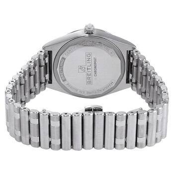 Stainless steel case with a stainless steel bracelet. Uni-directional rotating stainless steel bezel set with diamonds. White dial with luminous silver-tone hands and diamond-tipped index hour markers. Arabic numeral minute markers (at 5 minute intervals). Minute markers around the outer rim. Dial Type: Analog. Luminescent hands and markers. Date display at the 6 o'clock position. Breitling calibre 77 quartz movement. Scratch resistant sapphire crystal. Pull / push crown. Solid case back. Round case shape. Case size: 32 mm. Case thickness: 8.5 mm. Band width: 16 mm. Deployment clasp. Water resistant at 100 meters / 330 feet. Functions: date, hour, minute, second, chronometer. Chronomat Series. Dress watch style. Watch label: Swiss Made. Breitling Quartz Chronomat Diamond White Dial Ladies Watch A77310591A1A1.