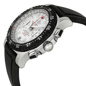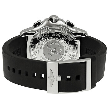 Stainless steel case with a diver pro II strap. Unidirectional rotating black ion-plated bezel. Silver dial with silver-tone hands and index hour markers. Minute markers. Tachymeter scale. Navitimer scale slide rule to measure speed time and distance. Dial Type: analog. Luminescent hands and markers. Date display at the 6 o'clock position. Chronograph - two sub-dials displaying: 60 seconds and dual 60 minutes / 12 hours. Scratch resistant sapphire crystal. Screw locked crown. Solid case back. Case diameter: 43 mm. Case thickness: 16 mm. Deployment clasp. Water resistant at 30 meters / 100 feet. Functions: hours, minutes, seconds, chronograph, tachmeter, date. Sport watch style. Breitling Skyracer Chronograph Men's Watch A2736434-G615BKPT.