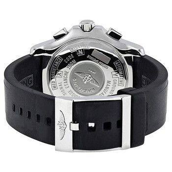 Stainless steel case with a black pro diver rubber strap. Bidirectional black ion-plated bezel. Blue dial with luminous hands and index hour markers. Minute markers. Tachymeter (Mile / Kilometer conversion) scale appears around the outer rim. Dial Type: Analog. Date display at the 6 o'clock position. Chronograph - two black sub-dials: dual 60 second / 12 hour and 60 minute. Automatic movement. Scratch resistant sapphire crystal. Screw locked crown. Case diameter: 43.5 mm. Case thickness: 16 mm. Round case shape. Deployment clasp. Water resistant at 200 meters / 660 feet. Functions: chronograph, date, hour, minute, second. Luxury watch style. Watch label: Swiss Made. Breitling Skyracer Raven Chrono Mariner Men's Watch A2736423-C804BKPT.