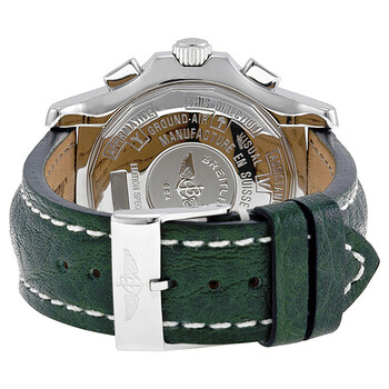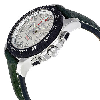 Stainless steel case with a green leather strap. Bi-directional rotating black ion-plated bezel. Silver dial with silver-tone hands and stick hour markers. Minute markers. Tachymeter around the outer rim. Dial Type: Analog. Luminescent hands and markers. Date display appears at the 6 o'clock position. Chronograph - two sub-dials: dual 60 second / 12 hour and 60 minute. Automatic movement. Scratch resistant sapphire crystal. Screw locked croen. Solid case back. Case diameter: 43.5 mm. Case thickness: 16 mm. Round case shape. Tang clasp. Water resistant at 200 meters / 660 feet. Functions: chronograph, date, hour, minute, second. Luxury watch style. Breitling Skyracer Raven Chronograph Automatic Silver Dial Men's Watch A2736434-G615.
