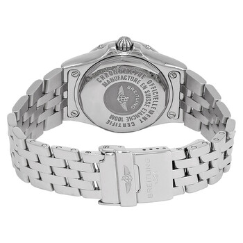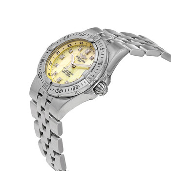Silver-tone stainless steel case and bracelet. Uni-directional rotating silver-tone stainless steel bezel. Yellow mother of pearl dial with silver-tone hands and diamond hour markers. Minute markers. 24 hour markings around the outer rim. Dial Type: Analog. Luminescent hands. Date display at the 3 o'clock position. Breitling Calibre 71 quartz movement. Scratch resistant sapphire crystal. Pull / push crown. Solid case back. Round case shape, case size: 30 mm, case thickness: 12.2 mm. Band width: 16 mm. Fold over clasp with a safety release. Water resistant at 100 meters / 330 feet. Functions: date, hour, minute, second, chronometer. Starliner Series. Luxury watch style. Watch label: Swiss Made. Breitling Starliner Quartz Chronometer Diamond Ladies Watch A7134012/I510.360A.