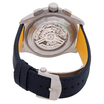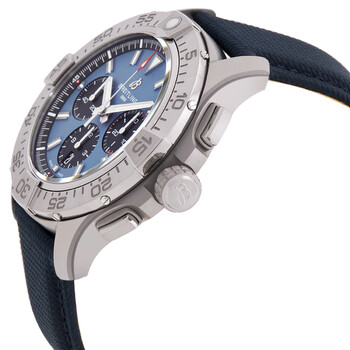 Silver-tone titanium case with a blue calfskin band. Uni-directional rotating silver-tone titanium bezel. Blue dial with silver-tone hands and index hour markers. Minute markers around the outer rim. Dial Type: Analog. Luminescent hands and markers. Date display at the 6 o'clock position. Chronograph - three sub-dials displaying: 60 second, 30 minute and 12 hour. Breitling Calibre 01 Automatic movement, containing 47 Jewels, composed of 346 parts, bitting at 28800 vph, and has a power reserve of approximately 70 hours. Scratch resistant sapphire crystal. Screw down crown. Transparent case back. Round case shape, case size: 46 mm, case thickness: 15.2 mm. Band width: 24/20 mm. Folding clasp. Water resistant at 300 meters / 1000 feet. Functions: chronograph, column wheel, date, hour, minute, second. Super Avenger Series. Sport watch style. Watch label: Swiss Made. Breitling Super Avenger B01 Chronograph Automatic Blue Dial Men's Watch EB0148101C1X1.