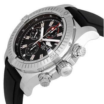 Stainless steel case with a black diver pro (rubber) bracelet. Unidirectional ratcheted stainless steel bezel. Black dial with luminous hands and index hour markers. Minute markers around the outer rim. Date display appears at the 3 o'clock position. Chronograph - three sub-dials dispalying: 12 hours, 30 minutes and 60 seconds. Selfwinding mechanical movement. Scratch resistant sapphire crystal. Solid case back. Case diameter: 48.40 mm. Case thickness: 18.60 mm. Deployment clasp. Water resistant at 300 meters / 1000 feet. Functions: hours, minutes, seconds, date, chronograph. Breitling Super Avenger Black Dial Rubber Strap Men's Watch A1337011-B907BKPD.