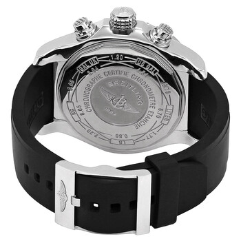 Silver-tone stainless steel case with a black rubber strap. Uni-directional silver-tone stainless steel bezel. White dial with silver-tone hands and Arabic numeral hour markers. Minute markers. 100 minute scale. Dial Type: Analog. Luminescent hands and markers. Date display at the 3 o'clock position. Chronograph - three sub-dials displaying: 60 second, 30 minute and 12 hour. Breitling Calibre 13 Automatic movement, based upon ETA Valjoux 7750, containing 25 Jewels, bitting at 28800 vph, and has a power reserve of approximately 42 hours. Scratch resistant glareproof sapphire crystal. Screw locked - two gaskets crown. Solid case back. Round case shape, case size: 48.6 mm, case thickness: 18.6 mm. Band width: 24 mm. Tang clasp. Water resistant at 300 meters / 1000 feet. Functions: chronograph, chronometer, date, hour, minute, second. Super Avenger Series. Sport watch style. Watch label: Swiss made. Breitling Super Avenger Chronograph Automatic Chronometer White Dial Men's Watch A1337011/B973.135S.A20S.1.