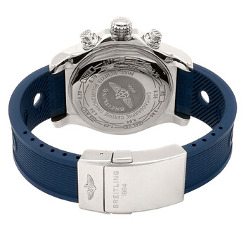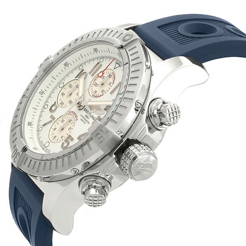Silver-tone stainless steel case with a blue rubber ocean racer strap. Uni-directional ratcheting stainless steel bezel. White dial with luminous hands and Arabic numeral hour markers. Minute markers. 1/100th scale around the outer rim. Dial Type: Analog. Luminescent hands and markers. Date display at the 3 o'clock position. Chronograph - three sub-dials displaying: 60 second, 30 minute and 12 hour. Breitling Calibre 13 Automatic movement, based upon ETA Valjoux 7750, containing 25 Jewels, bitting at 28800 vph, and has a power reserve of approximately 42 hours. Scratch resistant sapphire crystal. Screw locked with two gaskets crown. Screw in solid case back. Round case shape, case size: 48.6 mm, case thickness: 18.6 mm. Band width: 24 mm. Push button fold over clasp. Water resistant at 300 meters / 1000 feet. Functions: chronograph, chronometer, date, hour, minute, second. Super Avenger Series. Sport watch style. Watch label: Swiss Made. Breitling Super Avenger Chronograph Automatic Chronometer White Dial Men's Watch a1337011/b973 - 201s.