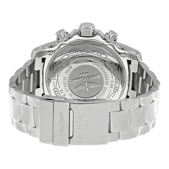 Stainless steel case with a stainless steel bracelet. Unidirectional stainless steel bezel. Black dial with luminous hands and Arabic numeral hour markers. Minute markers. 1/100th second scale around the outer rim. Dial Type: Analog. Luminescent hands and markers. Date display at the 3 o'clock position. Chronograph - three sub-dials displaying: 60 second, 30 minute and 12 hour. Breitling calibre 13 automatic movement with a 42-hour power reserve. Scratch resistant sapphire crystal. Screw locked crown - two gaskets. Solid case back. Case size: 48 mm. Case thickness: 17.75 mm. Round case shape. Band width: 24 mm - 20 mm. Deployment clasp. Water resistant at 300 meters / 1000 feet. Functions: chronograph, date, hour, minute, second. Luxury watch style. Watch label: Swiss Made. Breitling Super Avenger II Automatic Chronograph Men's Watch A1337111-BC28SS.