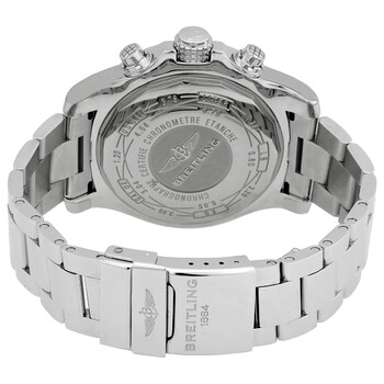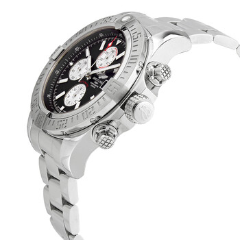 Silver-tone stainless steel case and bracelet. Uni-directional rotating silver-tone stainless steel bezel. Black dial with luminous silver-tone hands and index hour markers. Minute markers. 1/100th second scale around the outer rim. Dial Type: Analog. Luminescent hands and markers. Date display at the 3 o'clock position. Chronograph - three sub-dials displaying: 60 second, 30 minute and 12 hour. Breitling Calibre 13 Automatic movement, based upon ETA Valjoux 7750, containing 25 Jewels, bitting at 28800 vph, and has a power reserve of approximately 42 hours. Scratch resistant sapphire crystal. Screw down crown. Solid case back. Round case shape, case size: 48 mm. Band width: 24 mm. Water resistant at 300 meters / 1000 feet. Functions: chronograph, chronometer, date, hour, minute, second. Super Avenger II Series. Luxury watch style. Watch label: Swiss Made. Breitling Super Avenger II Black Dial Black Leather Men's Watch A1337111/BC29BKCD.