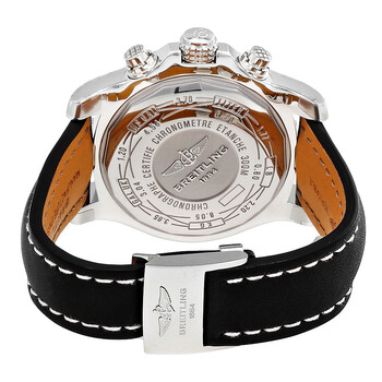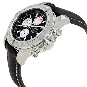 Stainless steel case with a black leather strap. Uni-directional rotating stainless steel bezel. Black dial with luminous silver-tone hands and index hour markers. Minute markers. 1/100th second scale around the outer rim. Dial Type: Analog. Luminescent hands and markers. Date display at the 3 o'clock position. Chronograph - three white sub-dials displaying: 60 second, 30 minute and 12 hour. Breitling calibre 13 automatic movement with a 42-hour power reserve. Scratch resistant sapphire crystal. Screw locked crown. Solid case back. Case size: 48 mm. Case thickness: 17.75 mm. Round case shape. Band width: 24 mm / 20 mm. Tang clasp. Water resistant at 300 meters / 1000 feet. Functions: chronograph, date, hour, minute, second. Luxury watch style. Watch label: Swiss Made. Breitling Super Avenger II Black Dial Black Leather Men's Watch A1337111/BC29BKLD.