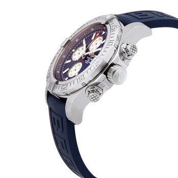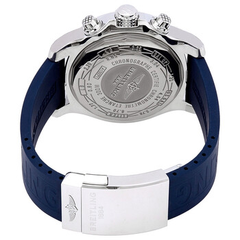 Silver-tone stainless steel case with a blue rubber strap. Uni-directional rotating silver-tone stainless steel bezel. Mariner blue dial with luminous silver-tone hands and index hour markers. Minute markers. 1/100 second markers around the outer rim. Dial Type: Analog. Luminescent hands and markers. Date display at the 3 o'clock position. Chronograph - three sub-dials displaying: 60 second, 30 minute and 12 hour. Breitling Calibre 13 Automatic movement, based upon ETA Valjoux 7750, containing 25 Jewels, bitting at 28800 vph, and has a power reserve of approximately 42 hours. Scratch resistant sapphire crystal. Screw down crown. Solid case back. Round case shape, case size: 48 mm, case thickness: 17.75 mm. Band width: 24 mm. Deployment with push button release clasp. Water resistant at 300 meters / 1000 feet. Functions: chronograph, date, hour, minute, second. Super Avenger II Series. Luxury watch style. Watch label: Swiss Made. Breitling Super Avenger II Chronograph Automatic Men's Watch A13371111C1S1.