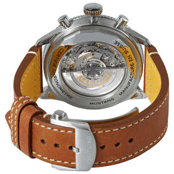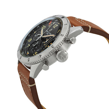 Stainless steel case with a brown (calfskin) leather strap. Bi-directional rotating stainless steel bezel. Black dial with luminous silver-tone hands and Arabic numeral hour markers. Minute markers. 24 hour markers around the outer rim. Dial Type: Analog. Luminescent hands and markers. Date display at the 6 o'clock position. Chronograph - three sub-dials displaying: 60 second, 30 minute and 12 hour. Breitling calibre 04 automatic movement, based upon Breitling calibre 01, containing 47 Jewels, bitting at 28000 vph, and has a power reserve of approximately 70 hours. Scratch resistant sapphire crystal. Screw down crown. Transparent case back. Round case shape. Case size: 46 mm. Case thickness: 15.9 mm. Band width: 24 mm. Fold over clasp with a safety release. Water resistant at 100 meters / 330 feet. Functions: chronograph, date, GMT, second time zone, hour, minute, second, chronometer. Super Avi Series. Casual watch style. Watch label: Swiss Made. Breitling Super Avi Chronograph Automatic Chronometer Black Dial Men's Watch AB04453A1B1X1.