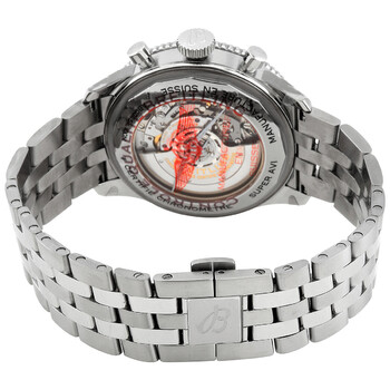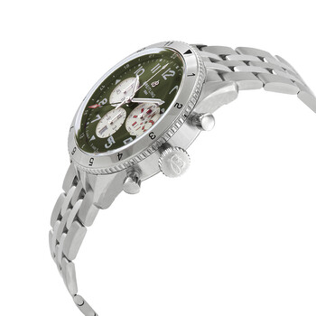 Silver-tone stainless steel case and bracelet. Bi-directional rotating silver-tone stainless steel bezel. Green dial with silver-tone hands and Arabic numeral hour markers. Minute markers around the outer rim. Dial Type: Analog. Luminescent hands. Date display at the 6 o'clock position. Chronograph - three sub-dials displaying: 60 second, 30 minute and 12 hours. Breitling Calibre 04 Automatic movement, based upon Breitling Calibre 01, containing 47 Jewels, bitting at 28000 vph, and has a power reserve of approximately 70 hours. Scratch resistant sapphire crystal. Transparent see through case back. Round case shape, case size: 46 mm, case thickness: 15.9 mm. Fold over clasp with a safety release. Water resistant at 100 meters / 330 feet. Functions: chronograph, date, GMT, second time zone, hour, minute, second, chronometer. Super Avi Series. Luxury watch style. Watch label: Swiss Made. Breitling Super Avi Chronograph Automatic Chronometer Green Dial Men's Watch AB04452A1L1A1.