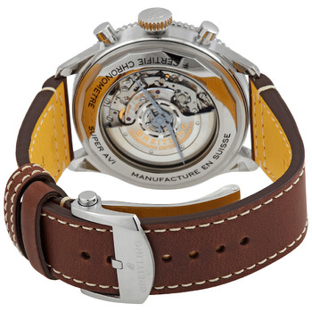Stainless steel case with a brown leather strap. Bi-directional rotating stainless steel bezel. Green dial with luminous silver-tone hands and Arabic numeral hour markers. Minute markers. 24 hour markers around the outer rim. Dial Type: Analog. Luminescent hands and markers. Date display at the 6 o'clock position. Chronograph - three silver sub-dials displaying: 60 second, 30 minute and 12 hour. Breitling calibre 04 automatic movement, based upon Breitling Calibre 01, containing 47 Jewels, bitting at 28000 vph, and has a power reserve of approximately 70 hours. Scratch resistant sapphire crystal. Screw down crown. Transparent case back. Round case shape. Case size: 46 mm. Case thickness: 15.9 mm. Band width: 24 mm / 20 mm. Fold over clasp. Water resistant at 100 meters / 330 feet. Functions: chronograph, date, GMT, second time zone, hour, minute, second, chronometer. Super Avi Series. Casual watch style. Watch label: Swiss Made. Breitling Super AVI Chronograph Automatic Chronometer Green Dial Men's Watch AB04452A1L1X1.