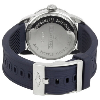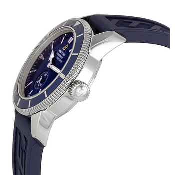 Stainless steel case with a blue rubber bracelet. Unidirectional ratcheting blue ion-plated bezel. Blue dial with luminous hands and stick hour markers. Minute markers around the outer rim. Date displays at the 3 o'clock position. Small seconds sub-dial at the 6 o'clock position. Self winding automatic movement. Scratch resistant cambered glareproofed sapphire crystal. Screw locked crown. Screwed in case back. Case diameter: 38 mm. Case thickness: 12.10 mm. Water resistant at 200 meters/ 660 feet. Breitling Superocean 38 Heritage Men's Watch A3732016-C73-119S.