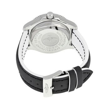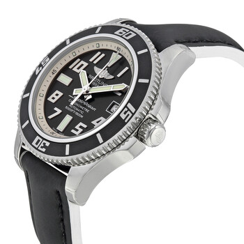 Stainless steel case with a black and white leather strap. Uni-directional rotating stainless steel bezel with a black top ring. Black dial with luminous silver-tone hands and Arabic numeral hour markers. Minute markers around the outer rim. Dial Type: Analog. Luminescent hands and markers. Date display at the 3 o'clock position. Automatic movement with a 40 hour power reserve. Scratch resistant sapphire crystal. Pull / push crown. Solid case back. Case diameter: 42 mm. Case thickness: 15 mm. Round case shape. Tang clasp. Water resistant at 1500 meters / 5000 feet. Functions: date, hour, minute, second. Luxury watch style. Watch label: Swiss Made. Breitling Superocean 42 Automatic Black Dial Black Leather Men's Watch A1736402-BA29BKWHT.