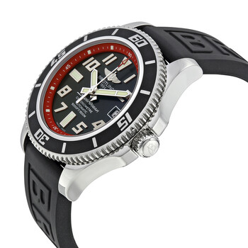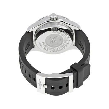 Stainless steel case with a black (diver pro III) rubber strap. Uni-directional rotating stainless steel bezel with a black top ring. Black dial with luminous silver-tone hands and Arabic numeral hour markers. Minute markers around the outer rim. Dial Type: Analog. Luminescent hands and markers. Date display at the 3 o'clock position. Automatic movement with a 40-hour power reserve. Scratch resistant sapphire crystal. Pull / push crown. Solid case back. Case diameter: 42 mm. Case thickness: 15 mm. Round case shape. Tang clasp. Water resistant at 1500 meters / 5000 feet. Functions: date, hour, minute, second. Luxury watch style. Watch label: Swiss Made. Item Variations: A1736402/BA31 150S-A18S.1. Breitling Superocean 42 Automatic Black Dial Black Rubber Strap Men's Watch A1736402-BA31BKPT3.