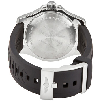 Stainless steel case with a black rubber strap. Uni-directional rotating coin edge stainless steel bezel with a black (count-up elapsed time) top ring. Black dial with luminous silver hands and index hour markers. Arabic numerals mark the 6, 9 and 12 o'clock positions. Minute markers around the outer rim. Dial Type: Analog. Luminescent hands and markers. Date display at the 3 o'clock position. Breitling calibre 17 automatic movement, based upon ETA 2824-2, containing 25 Jewels, bitting at 28800 vph, and has a power reserve of approximately 42 hours. Scratch resistant sapphire crystal. Screw locked crown. Solid case back. Round case shape. Case size: 42 mm. Case thickness: 13.3 mm. Band width: 20 mm. Tang clasp. Water resistant at 500 meters / 1650 feet. Functions: date, hour, minute, second. Superocean 42 Series. Dive watch style. Watch label: Swiss Made. Breitling Superocean 42 Automatic Black Dial Men's Watch A17366021B1S1.