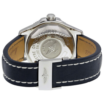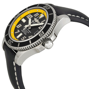 Stainless steel case with a black (calfskin) leather strap. Uni-directional rotating stainless steel with black top ring bezel. Black and yellow dial with luminous hands and Arabic numeral hour markers. Minute markers around the outer rim. Dial Type: Analog. Luminescent hands and markers. Date display at the 3 o'clock position. Automatic movement with a 42 hour power reserve. Scratch resistant sapphire crystal. Screw down crown. Solid case back. Case diameter: 42 mm. Case thickness: 15 mm. Round case shape. Band width: 20 mm. Tang clasp. Water resistant at 1500 meters / 5000 feet. Functions: date, hour, minute, second. Dress watch style. Watch label: Swiss Made. Breitling Superocean 42 Black and Yellow Dial Black Leather Men's Watch A1736402-BA32BKLD.
