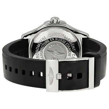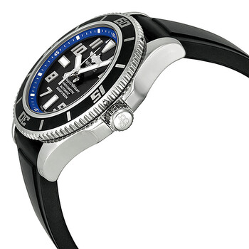 Stainless steel case with a black rubber strap. Uni-directional rotating black ion-plated bezel. Black dial with luminous hands and Arabic numeral hour markers. Minute markers around the outer rim. Dial Type: Analog. Luminescent hands and markers. Date display at the 3 o'clock position. Automatic movement. Scratch resistant sapphire crystal. Screw locked crown. Solid case back. Case diameter: 42 mm. Case thickness: 15 mm. Round case shape. Band width: 18 mm / 20 mm. Tang clasp. Water resistant at 1500 meters / 5000 feet. Functions: date, hour, minute, second. Luxury watch style. Watch label: Swiss Made. Breitling Superocean 42 Black Dial Rubber Strap Automatic Men's Watch A1736402-BA30BKPT.