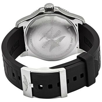 Stainless steel case with a black rubber strap. Uni-directional rotating stainless steel bezel with a black ring. Black dial with luminous silver-tone hands and index hour markers. Arabic numerals mark the 6, 9 and 12 o'clock positions. Minute markers around the outer rim. Dial Type: Analog. Luminescent hands and markers. Date display at the 3 o'clock position. Breitling calibre 17 automatic movement, based upon ETA 2824-2, containing 25 Jewels, bitting at 28800 vph, and has a power reserve of approximately 42 hours. Scratch resistant sapphire crystal. Screw locked crown. Solid case back. Round case shape. Case size: 44 mm. Case thickness: 14.2 mm. Band width: 22 mm. Tang clasp. Water resistant at 1000 meters / 3300 feet. Functions: date, hour, minute, second, chronometer. Luxury watch style. Watch label: Swiss Made. Breitling Superocean 44 Automatic Black Dial Men's Watch A17367D71B1S1.