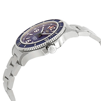 Stainless steel case with a stainless steel bracelet. Uni-directional rotating stainless steel bezel with a blue ring. Blue dial with luminous silver-tone hands and index hour markers. Arabic numerals mark the 6, 9 and 12 o'clock positions. minute markers around the outer rim. Dial Type: Analog. Luminescent hands and markers. Date display at the 3 o'clock position. Breitling calibre 17 automatic movement, based upon ETA 2824-2, containing 25 Jewels, bitting at 28800 vph, and has a power reserve of approximately 42 hours. Scratch resistant sapphire crystal. Screw locked crown. Solid case back. Round case shape. Case size: 44 mm. Case thickness: 14.2 mm. Band width: 22 mm. Fold over clasp with a push button release. Water resistant at 1000 meters / 3300 feet. Functions: date, hour, minute, second, chronometer. Luxury watch style. Watch label: Swiss Made. Breitling Superocean 44 Automatic Blue Dial Men's Watch A17367D81C1A1.