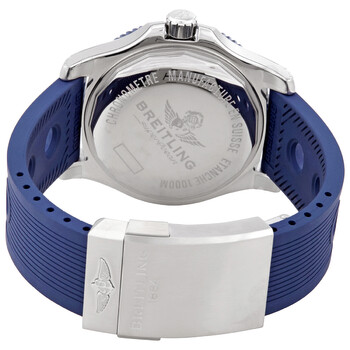 Silver-tone stainless steel case with a blue rubber strap. Uni-directional rotating silver-tone stainless steel with a blue ceramic ring bezel. Blue dial with luminous silver-tone hands and index hour markers. 24 hour markers. minute markers around the outer rim. Dial Type: Analog. Luminescent hands and markers. Date display at the 3 o'clock position. Breitling Calibre 17 Automatic movement, based upon ETA 2824-2, containing 25 Jewels, bitting at 28800 vph, and has a power reserve of approximately 42 hours. Scratch resistant sapphire crystal. Screw locked crown. Solid case back. Round case shape, case size: 44 mm, case thickness: 14.2 mm. Band width: 22/20 mm. Deployment with push button release clasp. Water resistant at 1000 meters / 3300 feet. Functions: date, hour, minute, second, chronometer. Luxury watch style. Watch label: Swiss Made. Breitling Superocean 44 Automatic Chronometer Blue Dial Watch Y1739316-C959/200s.