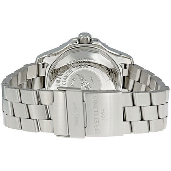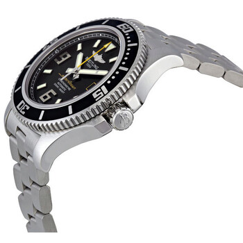 Stainless steel case with a stainless steel link bracelet. Unidirectional ion-plated bezel. Black dial with luminous hands and index hour markers. Arabic numerals mark the 6 and 9 o'clock posiyions. Minute markers around the outer rim. Dial Type: Analog. Date display appears at the 3 o'clock position. Automatic movement. Scratch resistant sapphire crystal. Case diameter: 44 mm. Deployment clasp. Water resistant at 2000 meters/ 6600 feet. Functions: hours, minutes, seconds, calendar. Luxury watch style. Breitling Superocean 44 Black Dial Automatic Men's Watch A1739012-BA78SS.