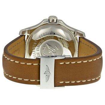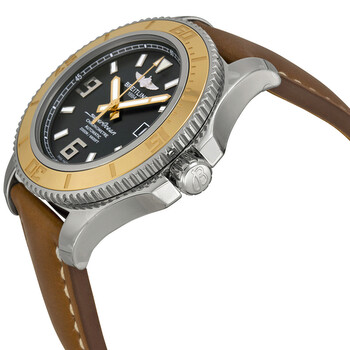 Silver-tone stainless steel case with a brown leather strap. Uni-directional rotating coin edge stainless steel bezel with a 18kt rose gold count-up elapsed time top ring. Black dial with luminous rose gold hands and index hour markers. Arabic numerals mark the 6 and 9 o'clock positions. minute markers around the outer rim. Dial Type: Analog. Luminescent hands and markers. Date display at the 3 o'clock position. Breitling Calibre 17 Automatic movement, based upon ETA 2824-2, containing 25 Jewels, bitting at 28800 vph, and has a power reserve of approximately 42 hours. Scratch resistant sapphire crystal. Screw locked crown. Solid case back. Round case shape, case size: 44 mm, case thickness: 16.7 mm. Band width: 22 mm. Deployment clasp. Water resistant at 2000 meters / 6600 feet. Functions: chronometer, date, hour, minute, second. Superocean 44 Series. Luxury watch style. Watch label: Swiss Made. Breitling Superocean 44 Black Dial Men's Watch C1739112-BA77BRLD.