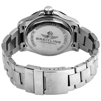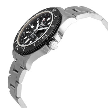 Stainless steel case and bracelet. Uni-directional rotating black ceramic bezel. Black dial with index hour markers. Dial Type: Analog. Date display at the 3 o'clock position. Breitling Calibre 17 Automatic movement, based upon ETA 2824-2, containing 25 Jewels, bitting at 28800 vph, and has a power reserve of approximately 42 hours. Scratch resistant sapphire crystal. Screw down crown. Solid case back. Round case shape, case size: 44 mm. Deployment clasp. Water resistant at 1000 meters / 3300 feet. Functions: date, hour, minute, second, chronometer. Superocean Series. Sport watch style. Watch label: Swiss Made. Breitling Superocean 44 Special Automatic Chronometer Black Dial Men's Watch Y17393101B1A1.