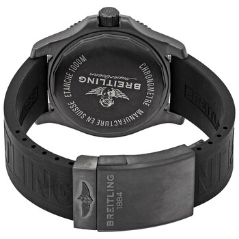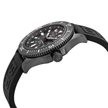 Breitling blacksteel steel case with a black rubber strap. Uni-directional rotating black bezel. Black dial with black hands and index hour markers. Minute markers around the outer rim. Dial Type: Analog. Luminescent hands and markers. Date display at the 3 o'clock position. Breitling Calibre 17 automatic movement, based upon ETA 2824-2, containing 25 Jewels, bitting at 28800 vph, and has a power reserve of approximately 42 hours. Scratch resistant sapphire crystal. Screw down crown. Solid case back. Round case shape, case size: 44 mm, case thickness: 14.20 mm. Band width: 22 mm. Deployment clasp. Water resistant at 1000 meters / 3300 feet. Functions: date, hour, minute, second. Dive watch style. Watch label: Swiss Made. Breitling Superocean 44 Special Automatic Men's Watch M1739313-BE92-153S-M20DSA.4.