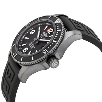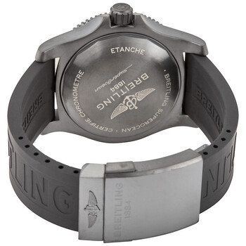 Black DLC stainless steel case with a black rubber (Diver Pro III) strap. Uni-directional rotating black DLC bezel with a black metallic ring. Black dial with luminous grey hands and index hour markers. Arabic numerals mark the 6, 9 and 12 o'clock positions. Minute markers around the outer rim. Dial Type: Analog. Luminescent hands and markers. Date display at the 3 o'clock position. Breitling calibre 17 automatic movement with a 38-hour power reserve. Scratch resistant sapphire crystal. Screw locked crown. Solid case back. Round case shape. Case size: 46 mm. Case thickness: 16.85 mm. Band width: 24 mm. Deployment clasp with a push button release. Water resistant at 2000 meters / 6600 feet. Functions: date, hour, minute, second. Dive watch style. Watch label: Swiss Made. Breitling Superocean 46 Automatic Black Dial Men's Watch M17368B71B1S2.