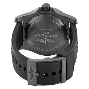 Black DLC stainless steel case with a black rubber (diver pro III) strap. Uni-directional rotating black DLC bezel with a black metallic ring. Yellow dial with luminous grey hands and index hour markers. Arabic numerals mark the 6, 9 and 12 o'clock positions. Minute markers around the outer rim. Dial Type: Analog. Luminescent hands and markers. Date display at the 3 o'clock position. Breitling calibre 17 automatic movement with a 38-hour power reserve. Scratch resistant sapphire crystal. Screw locked crown. Solid case back. Round case shape. Case size: 46 mm. Case thickness: 16.85 mm. Band width: 24 mm. Tang clasp. Water resistant at 2000 meters / 6600 feet. Functions: date, hour, minute, second. Dive watch style. Watch label: Swiss Made. Breitling Superocean 46 Automatic Men's Watch M17368D71I1S1.