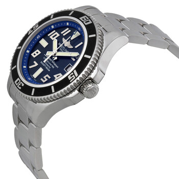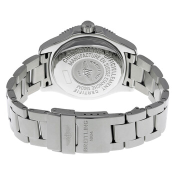 Silver-tone stainless steel case with a silver-tone stainless steel bracelet. Uni-directional rotating silver-tone stainless steel with a black ion-plated top ring bezel. Black dial with luminous hands and Arabic numeral hour markers. Minute markers around the outer rim. Dial Type: Analog. Luminescent hands and markers. Date display at the 3 o'clock position. Breitling Calibre 17 automatic movement with a 40-hour power reserve. Scratch resistant sapphire crystal. Screw locked crown. Solid case back. Round case shape, case size: 42 mm, case thickness: 15 mm. Band width: 20 mm. Deployment clasp. Water resistant at 1500 meters / 5000 feet. Functions: chronometer, date, hour, minute, second. Sport watch style. Watch label: Swiss Made. Breitling Superocean Abyss 42 Automatic Black Dial Men's Watch A1736402-BA3.