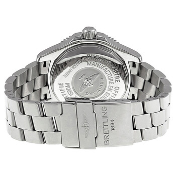 Stainless steel case with a stainless steel bracelet. Uni-directional rotating black ion-plated bezel. Black and orange dial with luminous hands and Arabic numeral hour markers. Minute markers around the outer rim. Dial Type: Analog. Luminescent hands and markers. Date display at the 3 o'clock position. Automatic movement. Scratch resistant sapphire crystal. Screw locked crown. Solid case back. Case diameter: 42 mm. Case thickness: 15 mm. Round case shape. Band width: 20 mm / 18 mm. Deployment clasp. Water resistant at 1500 meters / 5000 feet. Functions: date, hour, minute, second. Dress watch style. Watch label: Swiss Made. Breitling SuperOcean Automatic Black Dial Stainless Steel Men's Watch A17364Y4-BA89SS.