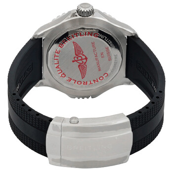 Silver-tone stainless steel case with a black rubber strap. Bi-directional rotating black stainless steel bezel. Black dial with silver-tone hands and index hour markers. Minute markers around the outer rim. Dial Type: Analog. Luminescent hands and markers. Breitling Calibre 17 Automatic movement, based upon ETA 2824-2, containing 25 Jewels, bitting at 28800 vph, and has a power reserve of approximately 42 hours. Scratch resistant sapphire crystal. Screw down crown. Solid case back. Round case shape, case size: 46 mm, case thickness: 13.2 mm. Band width: 24/20 mm. Folding clasp. Water resistant at 300 meters / 1000 feet. Functions: date, hour, minute, second, chronometer. Superocean Series. Dive watch style. Watch label: Swiss Made. Breitling Superocean Automatic Chronometer Black Dial Men's Watch A17378211B1S1.
