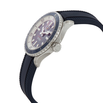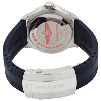 Silver-tone stainless steel case with a blue rubber strap. Uni-directional rotating silver-tone stainless steel bezel with an inlaid blue ring. Blue dial with silver-tone hands and index hour markers. Minute markers around the outer rim. Dial Type: Analog. Luminescent hands and markers. Breitling Calibre 17 Automatic movement, based upon ETA 2824-2, containing 25 Jewels, bitting at 28800 vph, and has a power reserve of approximately 42 hours. Scratch resistant sapphire crystal. Screw down crown. Solid case back. Round case shape, case size: 42 mm, case thickness: 12.5 mm. Band width: 22/18 mm. Folding clasp. Water resistant at 300 meters / 1000 feet. Functions: hour, minute, second, chronometer. Superocean Series. Sport watch style. Watch label: Swiss Made. Breitling Superocean Automatic Chronometer Blue Dial Men's Watch A17375E71C1S1.
