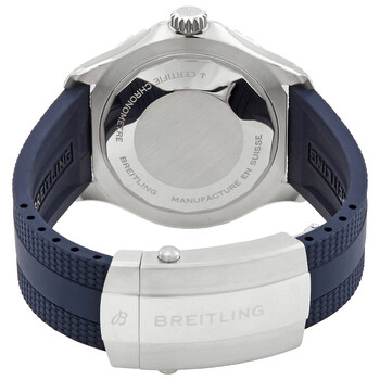 Silver-tone stainless steel case with a blue rubber strap. Uni-directional rotating black bezel. Blue dial with silver-tone hands and index hour markers. Minute markers around the outer rim. Dial Type: Analog. Luminescent hands and markers. Breitling Calibre 17 Automatic movement, based upon ETA 2824-2, containing 25 Jewels, bitting at 28800 vph, and has a power reserve of approximately 42 hours. Scratch resistant sapphire crystal. Screw down crown. Solid case back. Round case shape, case size: 44 mm. Fold over clasp with a safety release. Water resistant at 300 meters / 1000 feet. Functions: hour, minute, second, chronometer. Additional Info: original box, manual (complete accessories). Superocean Series. Dive watch style. Watch label: Swiss Made. Breitling Superocean Automatic Chronometer Blue Dial Men's Watch A17376211C1S1.
