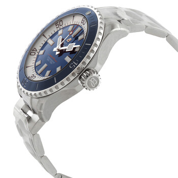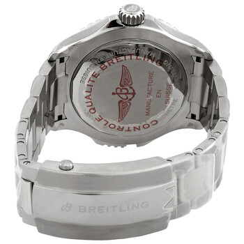 Silver-tone stainless steel case and bracelet. Bi-directional rotating blue ceramic bezel. Blue dial with silver-tone hands and index hour markers. Minute markers around the outer rim. Dial Type: Analog. Luminescent hands and markers. Breitling Calibre 17 Automatic movement, based upon ETA 2824-2, containing 25 Jewels, bitting at 28800 vph, and has a power reserve of approximately 42 hours. Scratch resistant sapphire crystal. Screw down crown. Solid case back. Round case shape, case size: 46 mm, case thickness: 13.2 mm. Band width: 24 mm. Push button folding clasp. Water resistant at 300 meters / 1000 feet. Functions: hour, minute, second, chronometer. Superocean Series. Dive watch style. Watch label: Swiss Made. Breitling Superocean Automatic Chronometer Blue Dial Men's Watch A17378E71C1A1.