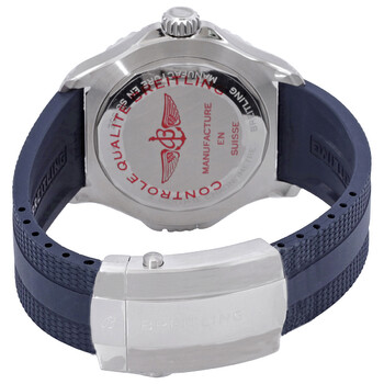 Silver-tone stainless steel case with a blue rubber strap. Bi-directional rotating blue ceramic bezel. Blue dial with silver-tone hands and index hour markers. Minute markers around the outer rim. Dial Type: Analog. Luminescent hands and markers. Breitling Calibre 17 Automatic movement, based upon ETA 2824-2, containing 25 Jewels, bitting at 28800 vph, and has a power reserve of approximately 42 hours. Scratch resistant sapphire crystal. Screw down crown. Solid case back. Round case shape, case size: 46 mm, case thickness: 13.2 mm. Band width: 24 mm. Folding clasp. Water resistant at 300 meters / 1000 feet. Functions: hour, minute, second, chronometer. Superocean Series. Dive watch style. Watch label: Swiss Made. Breitling Superocean Automatic Chronometer Blue Dial Men's Watch A17378E71C1S1.