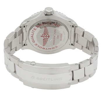 Silver-tone stainless steel case and bracelet. Uni-directional rotating stainless steel bezel. Blue dial with silver-tone hands and index hour markers. Minute markers around the outer rim. Dial Type: Analog. Luminescent hands and markers. Breitling Calibre 17 Automatic movement, based upon ETA 2824-2, containing 25 Jewels, bitting at 28800 vph, and has a power reserve of approximately 42 hours. Scratch resistant sapphire crystal. Screw down crown. Solid case back. Round case shape, case size: 44 mm, case thickness: 12.6 mm. Band width: 22/18 mm. Folding clasp. Water resistant at 300 meters / 1000 feet. Functions: hour, minute, second, chronometer. Superocean Series. Luxury watch style. Watch label: Swiss Made. Breitling Superocean Automatic Chronometer Blue Dial Watch A17376211C1A1.