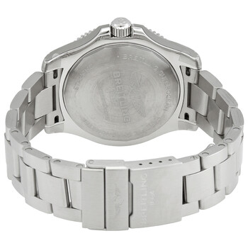 Stainless steel case with a stainless steel bracelet. Uni-directional rotating stainless steel bezel with an inlaid black ring. Orange dial with luminous gunmetal hands and index hour markers. Arabic numerals mark the 6, 9 and 12 o'clock positions. Minute markers around the outer rim. Dial Type: Analog. Luminescent hands and markers. Date display at the 3 o'clock position. Breitling calibre 17 automatic movement, based upon ETA 2824-2, containing 25 Jewels, bitting at 28800 vph, and has a power reserve of approximately 42 hours. Scratch resistant sapphire crystal. Screw down crown. Solid case back. Round case shape. Case size: 42 mm. Case thickness: 13.30 mm. Band width: 20 mm. Fold over clasp. Water resistant at 500 meters / 1650 feet. Functions: date, hour, minute, second, chronometer. Dive watch style. Watch label: Swiss Made. Breitling Superocean Automatic Chronometer Orange Dial Men's Watch A17366D7101A1.