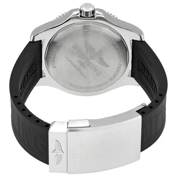 Stainless steel case with a black rubber strap. Uni-directional rotating stainless steel bezel with a black ring. Orange dial with luminous grey hands and index hour markers. Arabic numerals mark the 6, 9 and 12 o'clock positions. Minute markers around the outer rim. Dial Type: Analog. Luminescent hands and markers. Date display at the 3 o'clock position. Breitling calibre 17 automatic movement, based upon ETA 2824-2, containing 25 Jewels, bitting at 28800 vph, and has a power reserve of approximately 42 hours. Scratch resistant sapphire crystal. Screw down crown. Solid case back. Round case shape. Case size: 42 mm. Case thickness: 13.30 mm. Band width: 20 mm / 18 mm. Fold over clasp. Water resistant at 500 meters / 1650 feet. Functions: date, hour, minute, second, chronometer. Dive watch style. Watch label: Swiss Made. Breitling Superocean Automatic Chronometer Orange Dial Men's Watch A17366D71O1S2.