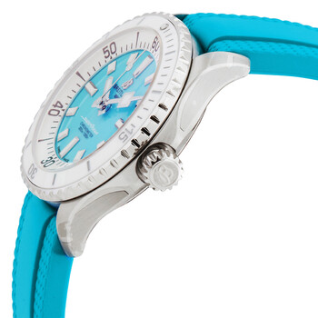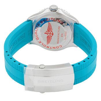 Silver-tone stainless steel case with a turquoise rubber strap. Uni-directional rotating silver-tone stainless steel bezel. Turquoise dial with silver-tone hands and index hour markers. Minute markers around the outer rim. Dial Type: Analog. Luminescent hands and markers. Breitling Calibre 17 Automatic movement, based upon ETA 2824-2, containing 25 Jewels, bitting at 28800 vph, and has a power reserve of approximately 42 hours. Scratch resistant sapphire crystal. Screw down crown. Solid case back. Round case shape, case size: 36 mm, case thickness: 12.2 mm. Band width: 18/16 mm. Folding clasp. Water resistant at 300 meters / 1000 feet. Functions: hour, minute, second, chronometer. Superocean Series. Sport watch style. Watch label: Swiss Made. Breitling Superocean Automatic Chronometer Turquoise Dial Ladies Watch A17377211C1S1.