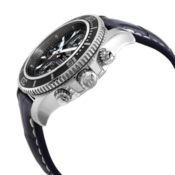 Stainless steel case with a blue (crocodile) leather strap. Uni-directional rotating stainless steel bezel with an inlaid black ring. Black dial with luminous silver-tone hands and index hour markers. Minute markers. 1/100th second markers around the outer rim. Dial Type: Analog. Luminescent hands and markers. Date display at the 3 o'clock position. Chronograph - three sub-dials displaying: 60 second, 30 minute and 12 hours. Breitling calibre 13 automatic movement, based upon ETA Valjoux 7750, containing 25 Jewels, bitting at 28800 vph, and has a power reserve of approximately 42 hours. Scratch resistant sapphire crystal. Screw down crown. Solid case back. Round case shape. Case size: 44 mm. Case thickness: 17.2 mm. Band width: 22 mm. Tang clasp. Water resistant at 500 meters / 1650 feet. Functions: chronograph, date, hour, minute, second. Superocean Series. Dive watch style. Watch label: Swiss Made. Breitling Superocean Chronograph Automatic Black Dial Men's Watch A1334102/BA83-731P.