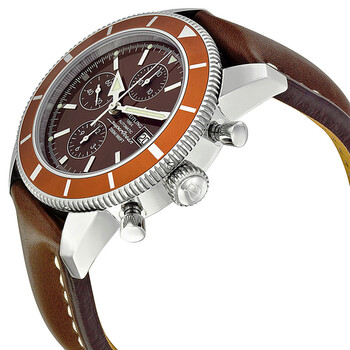 Stainless steel case with a brown leather strap. Uni-directional rotating stainless steel bezel with a brown ion-plated top ring. Brown dial with luminous silver-tone hands and index hour markers. Minute markers around the outer rim. Dial Type: Analog. Luminescent hands and markers. Date display at the 3 o'clock position. Chronograph - three sub-dials displaying: 60 second, 30 minute and 12 hour. Breitling calibre 13 automatic movement with a 42-hour power reserve. Scratch resistant sapphire crystal. Screw locked crown - two gaskets. Solid case back. Round case shape, case size: 46 mm. Case thickness: 16.8 mm. Band width: 24 mm / 20 mm, band length: 9 inches. Tang clasp. Water resistant at 200 meters / 660 feet. Functions: chronograph, chronometer, date, hour, minute, second. Luxury watch style. Breitling Superocean Chronograph Brown Dial Men's Watch A1332033-Q553BRLT.