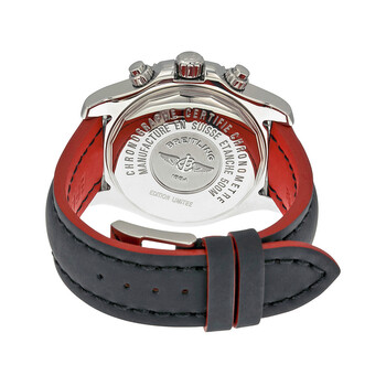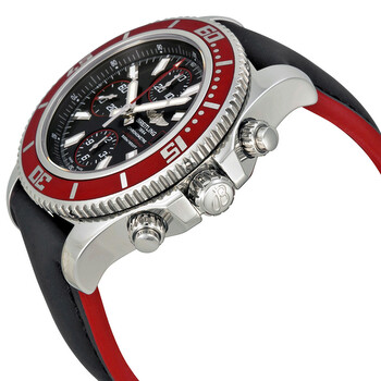 Stainless steel case with a black leather (red backed) strap. Uni-directional rotating stainless steel bezel with red top ring. Black dial with luminous hands and index hour markers. Minute markers. 1/100th markers around the outer rim. Dial Type: Analog. Luminescent hands and markers. Date display at the 3 o'clock position. Chronograph - three sub-dials displaying: 60 second, 30 minute and 12 hour. Automatic movement with a 42 hour power reserve. Scratch resistant sapphire crystal. Screw locked crown. Solid case back. Case diameter: 44 mm. Case thickness: 17.2 mm. Round case shape. Band width: 22 mm. Tang clasp. Water resistant at 500 meters / 1650 feet. Functions: chronograph, date, hour, minute, second. Luxury watch style. Watch label: Swiss Made. Breitling Superocean Chronograph II Automatic Black Dial Black Leather Men's Watch A13341X9-BA81BKRLT.