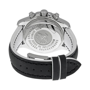Stainless steel case with a black leather (white backed) strap. Uni-directional rotating stainless steel bezel with 18kt gold top ring. Black dial with luminous gold-tone hands and index hour markers. Minute markers. 1/100th markers around the outer rim. Dial Type: Analog. Luminescent hands and markers. Date display at the 3 o'clock position. Chronograph - three sub-dials displaying: 60 second, 30 minute and 12 hour. Automatic movement. Scratch resistant sapphire crystal. Screw locked crown. Solid case back. Case diameter: 44 mm. Case thickness: 17.2 mm. Round case shape. Tang clasp. Water resistant at 500 meters / 1650 feet. Functions: chronograph, date, hour, minute, second. Luxury watch style. Watch label: Swiss Made. Breitling Superocean Chronograph II Automatic Black Dial Black Leather Men's Watch C1334112-BA84BKWLT.