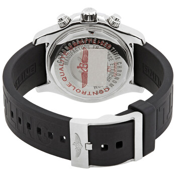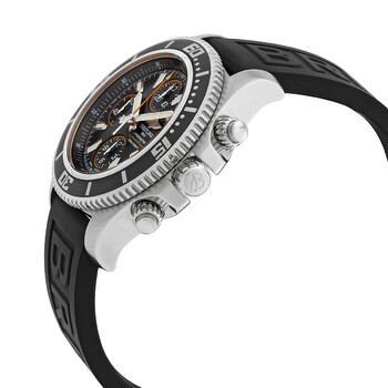 Silver-tone stainless steel case with a rubber (black diver pro iii) strap. Uni-directional rotating silver-tone stainless steel bezel with a black ring. Black dial with silver-tone hands and index hour markers. Minute markers. 1/100th markers around the outer rim. Dial Type: Analog. Luminescent hands and markers. Date display at the 3 o'clock position. Chronograph - three sub-dials displaying: 60 second, 30 minute and 12 hour. Breitling Calibre 13 Automatic movement, based upon ETA Valjoux 7750, containing 25 Jewels, bitting at 28800 vph, and has a power reserve of approximately 42 hours. Scratch resistant glareproofed sapphire crystal. Screw locked crown. Solid case back. Round case shape, case size: 44 mm, case thickness: 17 mm. Band width: 22 mm. Tang clasp. Water resistant at 500 meters / 1650 feet. Functions: chronograph, chronometer, date, hour, minute, second. Superocean Chronograph II Series. Casual watch style. Watch label: Swiss Made. Breitling SuperOcean Chronograph II Automatic Chronometer Black Dial Men's Watch A1334102-BA85-134ARS-RDS.