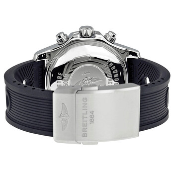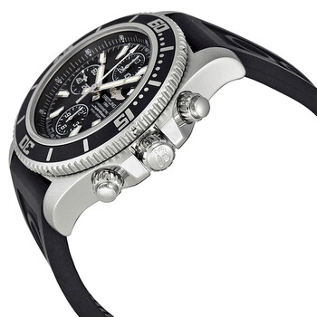Stainless steel case with a black rubber strap. Uni-directional rotating bezel. Black dial with silver-tone hands and stick hour markers. Minute markers around the outer rim. Dial Type: Analog. Luminescent hands and markers. Date display appears at the 3 o'clock position. Chronograph - three sub-dials displaying: 60 second, 30 minute and 12 hour. Automatic movement with 42 hour power reserve. Breitling 13 engine. Scratch resistant sapphire crystal. Screw down crown. Solid case back. Case diameter: 44 mm. Case thickness: 17.2 mm. Round case shape. Band width: 22 mm. Fold over clasp with safety. Water resistant at 500 meters / 1650 feet. Functions: chronograph, date, hour, minute, second. Luxury watch style. Breitling Superocean Chronograph II Automatic Men's Watch A1334102-BA84BKOR.