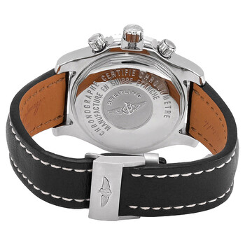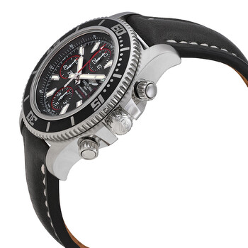 Stainless steel case with a black leather strap. Uni-directional rotating bezel. Black dial with luminous silver-tone hands and luminous index hour markers. Minute markers around the outer rim. Dial Type: Analog. Luminescent hands and markers. Date display at the 3 o'clock position. Chronograph - three sub-dials displaying: 60 second, 30 minute and 12 hour. Automatic movement. Breitling 13 engine. Scratch resistant sapphire crystal. Screw down crown. Solid case back. Case diameter: 44 mm. Round case shape. Deployment clasp. Water resistant at 500 meters / 1650 feet. Functions: chronograph, date, hour, minute, second. Luxury watch style. Breitling Superocean Chronograph II Black Dial Automatic Men's Watch A1334102/BA81BKLD.